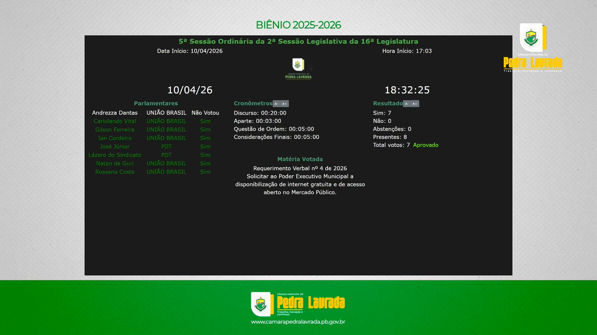 Encerradas as discussões, o requerimento verbal foi colocado em votação e aprovado por unanimidade pelos vereadores presentes.