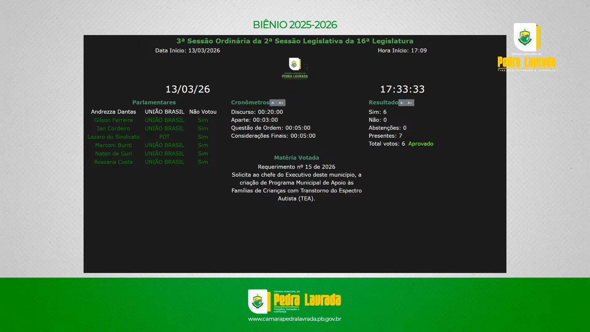 A Câmara Municipal de Pedra Lavrada aprovou, por unanimidade, na sessão ordinária realizada no dia 13 de março, o Requerimento nº 015/2026, de autoria do vereador José Gilson Ferreira dos Santos (União Brasil). A proposta solicita ao Poder Executivo a criação de um Programa Municipal de Apoio às Famílias de Crianças e Adolescentes com Transtorno do Espectro Autista (TEA).