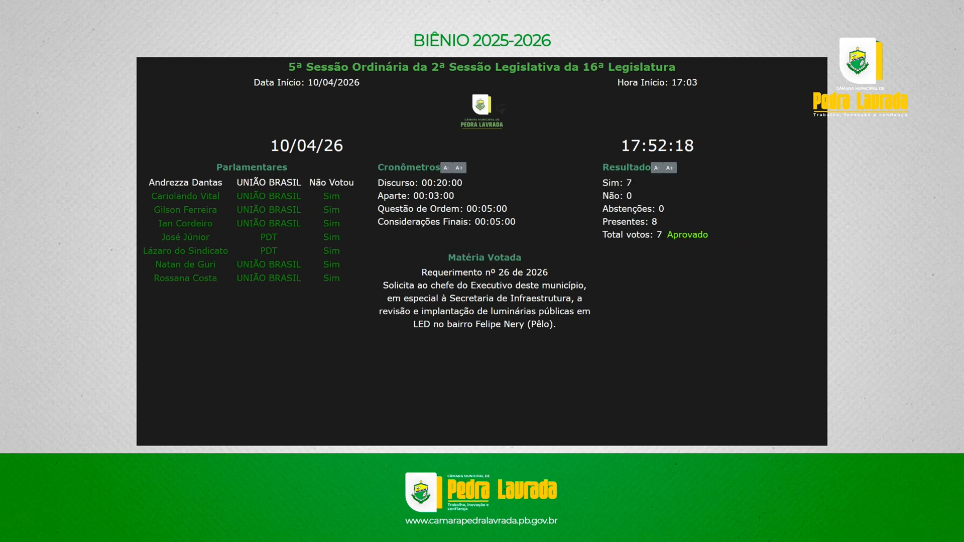 A Câmara Municipal de Pedra Lavrada aprovou, durante sessão ordinária realizada nesta sexta-feira (10), o Requerimento nº 026/2026, de autoria do vereador Natan Vasconcelos Dantas, que solicita ao Poder Executivo a revisão do sistema de iluminação pública e a implantação de luminárias em LED no bairro Felipe Nery (Pêlo).